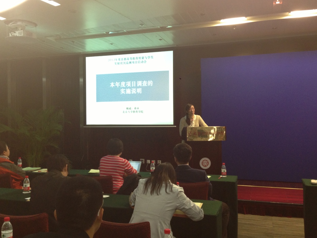 项目组成员、北京大学教育学院鲍威副教授对本年度项目整体运作计划和本科生调查问卷框架进行了全面的介绍,并强调了问卷回收的相关事项。蒋承老师对2013年本科抽样方案进行了介绍。今年本科组计划抽样约4万个样本,覆盖北京市54所高等院校。杨钋副教授介绍了2013年追踪组针对大学三年级学生的抽样方案,今年将继续对参加过2011–2012年调查的学生进行追踪,并补充部分样本,共计发放问卷5386份,覆盖北京市28所高等院校。朱红副教授介绍了2013年研究生组的调查方案,计划今年推进数据深度挖掘,开展院校案例研究和其他专题的质性研究,选取代表院校进行访谈调研。赵国栋副教授介绍了网络调查的实现方式和操作过程。