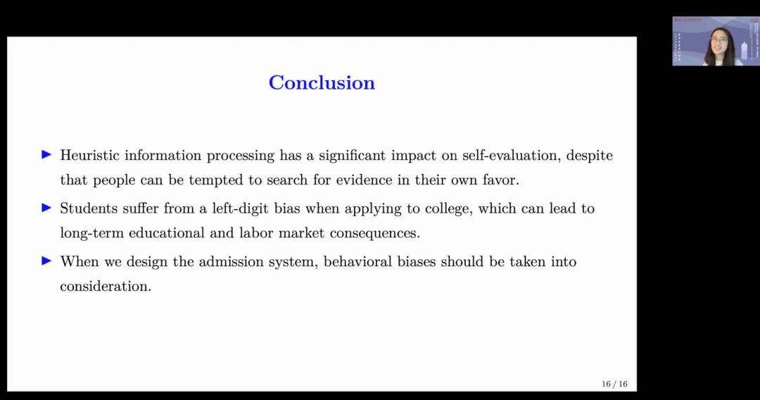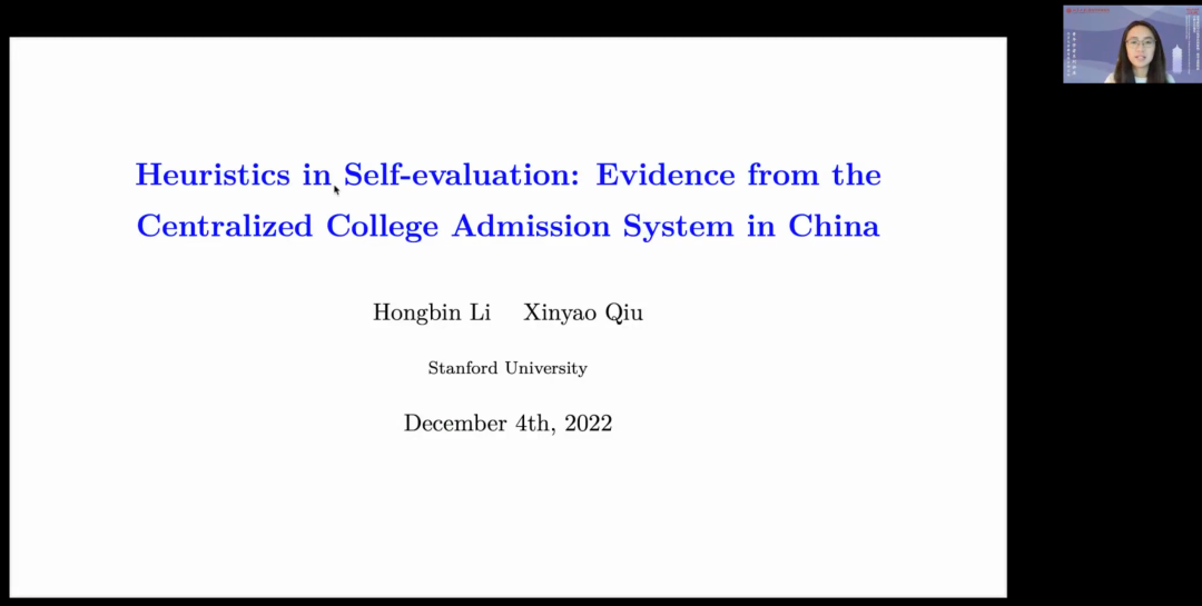 2022年12月4日上午,北京大学教育经济研究所举办2022年第6期青年学者系列讲座。本期讲座的主题为“思考捷径对自我评估的影响:高考志愿填报中的左位偏见(Heuristics in Self-evaluation: Evidence from the Centralized College Admission System in China)”,由斯坦福大学经济学博士候选人邱昕瑶主讲。