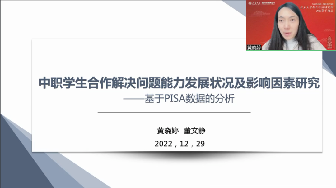 黄晓婷长聘副教授分享了题为《中职学生合作解决问题能力发展状况及影响因素研究——基于PISA数据的分析》的主旨报告。为了探究中职学生合作解决问题能力的水平及其主要影响因素,该研究基于PISA2015年度数据展开了实证分析。研究基于倾向得分匹配(PSM)的方法并构建双层线性模型(HLM)发现,学校类别对学生合作解决问题能力有显著影响且效应量大,中职学生合作解决问题能力显著低于普通高中学生。在合作解决问题能力的影响因素方面,学生的性别、家庭社经背景以及合作态度、自我效能对于合作解决问题能力都有着正向影响,而成就动机对合作解决问题能力的影响有显著负向影响,可能的原因是传统科目学习不强调团队合作而是独立学习;而从学校的角度来看,教师质量、教师数量、师生关系及学校自主权均对学生合作解决问题能力有显著正向影响,而教师信息技术使用能力对学生合作解决问题能力有着显著负向影响,相关教学软件的缺乏以及教学惯性是这一负向影响的可能原因。进一步的分样本回归发现,在学生个体层面,普高与职高学生的ESCS、性别因素保持了一致性;非认知能力的影响方向也相同,但效应大小存在差异:合作态度、自我效能对普高学生有正向影响,但对中职学生不显著;成就动机对两组学生都显示出负向影响,但对中职学生的影响较小。在学校层面,教师质量、师生关系对两组学生均具有显著正向影响,而教师数量、学校自主权仅对普高学生有正向影响,教师信息技术使用能力也仅对普高学生有着负向影响,这可能和学校的教学内容、教学形式和管理方有关。此外,学校氛围却对中职学生呈现显著负向影响。