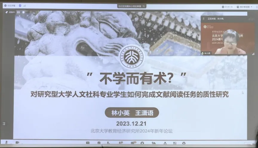 2023年12月21日下午,2024年新年论坛分论坛一“大学生学习行为的经济学分析”率先开讲。北京大学教育学院教育管理与政策系副系主任张冉副教授主持。张冉副教授和化学与分子工程学院博士研究生郭佳晨同学、教育经济研究所卢晓东研究员、副所长马莉萍长聘副教授、林小英长聘副教授、清华大学教育研究院郭菲副教授出席并作学术报告。