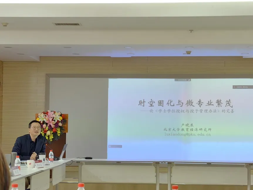 北京大学教育经济研究所卢晓东研究员,作题为《时空固化及其突破——论《学士学位授权与授予管理办法》的完善》的报告。该研究重点从时空固化与微专业的繁茂性来讨论《学士学位授权与授予管理办法》的完善。研究中发现,双学位和联合学士学位的发放时间受高考招生政策限制,导致时间固化。此外,辅修学士学位的授予问题也引起讨论,认为应考虑空间限制,辅修学位无法构成一种学位,且辅修学分较少。卢晓东老师还强调了跨学科辅修双学位和教育与文明发展的教育问题,并认为应单独发放双学士学位证书和成绩单,以推动符合性人才培养和优质教育资源共享。