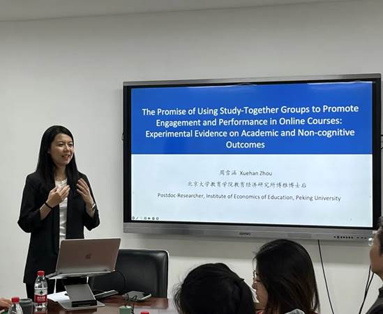 2024年1月9日中午,北京大学教育经济研究所举办2024年第3期(总第20期)青年学者系列讲座。本期讲座的主题为“利用学习小组促进在线课程参与度与学业表现:一项关于学业与非认知成果的实验研究”,由北京大学教育学院教育经济研究所博雅博士后周雪涵主讲。讲座由北京大学教育学院教育经济与管理系系主任、教育经济研究所长聘副教授杨钋主持。北京大学教育经济研究所所长丁小浩教授、教育学院院长阎凤桥教授、副所长马莉萍长聘副教授、陈晓宇教授、丁延庆副教授和朱琼助理教授参与点评。教育学院多名师生到场参与。讲座伊始,杨钋长聘副教授对报告人和与会师生表示热烈欢迎,并介绍了讲座报告人的教育背景和研究领域。周雪涵博士首先对个人的研究背景和研究成果进行了简要介绍。在站期间,周雪涵博士在SSCI期刊《The Internet and Higher Education》发表2篇论文,获得了“中国博士后科学基金”与“北京市教育科学“十四五”规划青年专项课题”资助。