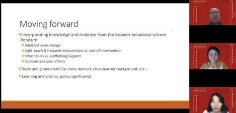 李秋劼博士的报告围绕“在线教育的评估与提升”主题展开,首先向大家介绍了在线教育的发展、优势和难点,以及在线学习效果评估的研究现状,接下来详细介绍了自己的两篇研究。第一项研究以墨西哥一所公立大学的英语课程为研究对象,通过2007~2016年2万余个观测,检验了线上线下混合教学相较于完全面授课程的成效,研究发现:在控制了学生和课程固定效应后,混合教学能够显著提高学生的学习成绩和完成率。第二项研究基于一项关于在线学习中信息反馈干预的随机实验,结合教育心理学的归因理论,验证了信息反馈对学生学习归因和学习成效的影响。研究发现:通过在学生学习的反思环节增加学生自身和同伴的学习时长反馈,可以显著提高那些认为自身表现不好学生的学习时长和努力程度,但是对学生的成绩没有显著影响。