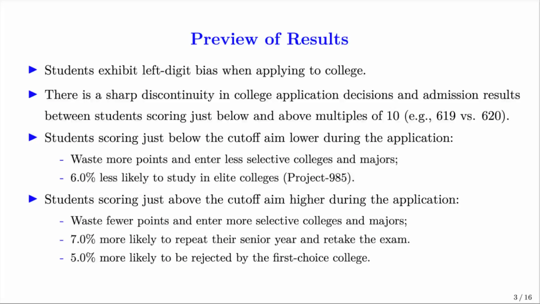 研究发现,即使在高考志愿填报这样重要的情境下,考生的决策仍然无法摆脱左位偏见这类非理性思维的影响,这表现为整十数位附近学生申请和录取情况的明显不连续性。具体的,那些考分恰好低于十的倍数(例如549分)的考生更倾向于采取相对保守的志愿填报策略,也最终被录取到名次更低的院校专业。反之,那些考分恰好等于或高于十的倍数(例如550分或551分)的考生对自己的成绩更为满意,同时倾向于选择更加激进的填报策略,他们会浪费更少的分数,进入选择性更强的大学和专业,复读重考的可能性增加7.0%,被第一志愿大学拒绝的可能性增加5.0%。
