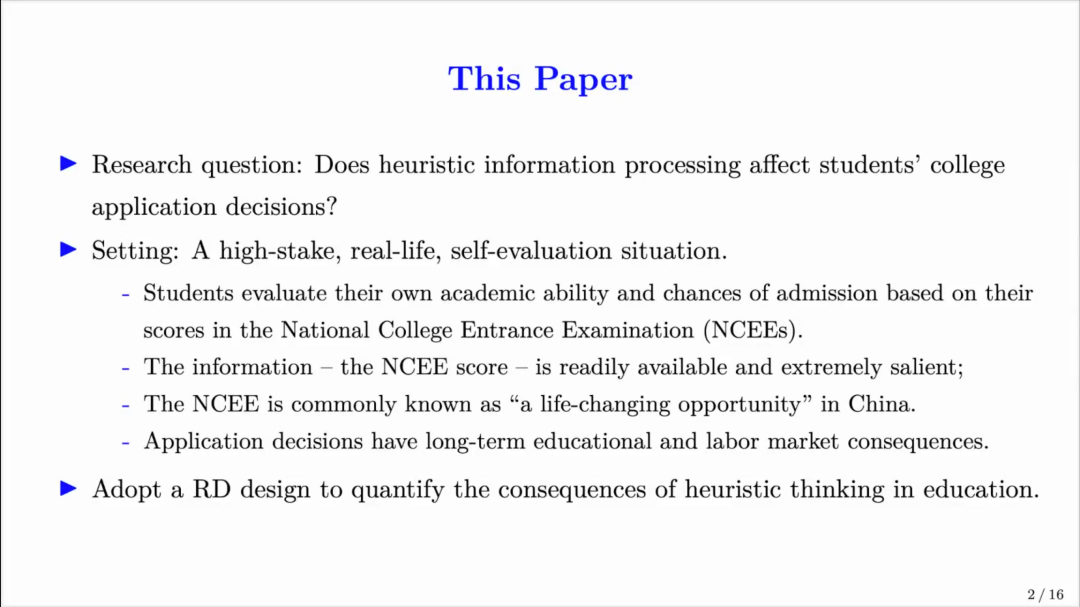 2022年12月4日上午,北京大学教育经济研究所举办2022年第6期青年学者系列讲座。本期讲座的主题为“思考捷径对自我评估的影响:高考志愿填报中的左位偏见(Heuristics in Self-evaluation: Evidence from the Centralized College Admission System in China)”,由斯坦福大学经济学博士候选人邱昕瑶主讲。