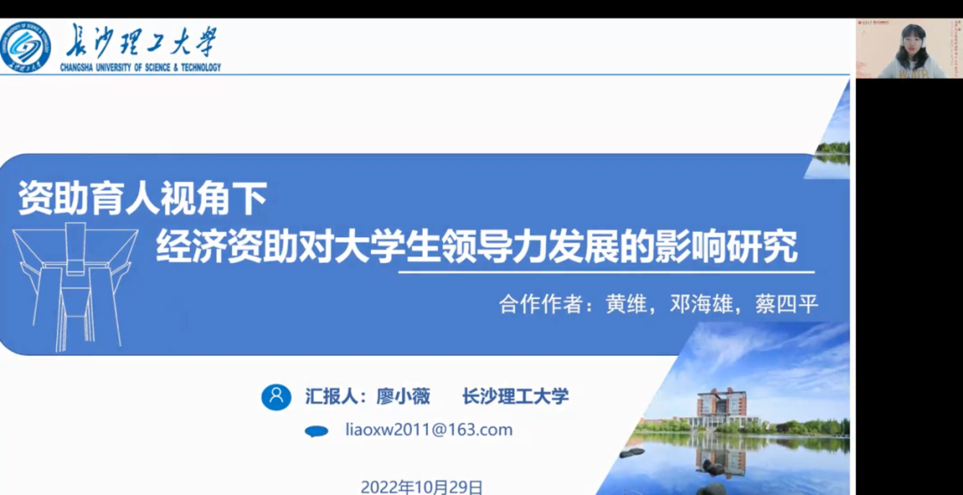 长沙理工大学博士生廖小薇汇报了《资助育人视角下经济资助对大学生领导力发展的影响研究》一文。研究依据学生参与理论和资助育人的实践需求,基于2016和2018年湖南高校大学生发展数据,利用倾向得分匹配法控制了样本的选择性偏差,计量评估了经济资助对大学生领导力发展水平的影响。研究发现:女生、农村户口、非独生子女、高考成绩好、家庭年收入低、父亲受教育程度低、父亲不在体制内工作等的大学生更有可能获得经济资助;经济资助可以显著促进领导力发展,在变换因变量后结果依然稳健;影响存在异质性,从促进大学生领导力发展的角度,同时获得“奖优”与“助困”资助比仅获得“奖优”或“助困”资助的效果更好;经济资助对大学生领导力发展的影响是通过促进学业参与和社会参与实现的。随后点评专家肯定了研究的价值,在结果解释上和汇报人进行了热烈的讨论。