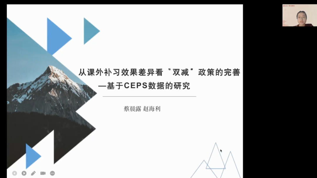 浙江财经大学博士生蔡晨露汇报了《从课外补习效果差异看“双减”政策的完善——基于CEPS数据的研究》一文。研究利用中国教育追踪调查(CEPS)数据,实证分析了课外补习对学生学业成绩的影响及其异质性。结果表明,从平均影响来看,课外补习对学业成绩具有明显的正向效应。但是,在学校质量较好的中心城区,以及课外补习机构林立、“内卷”现象较为严重的大城市,课外补习对学生成绩的负向影响已经显现。从课外补习对学业成绩的异质性影响看,与父母不同住的学生、流动学生以及学校质量较差的学生,“双减”政策对其影响可能更大。根据影响差异,研究进一步提出完善“双减”政策的建议,包括对弱势家庭学生实施校内补习应提质延时,通过资源共享“下沉”优质教育资源到农村和偏远地区,积极引导校外培训机构及培训教师转型等。随后点评专家从研究意义和方法的角度和汇报人展开深入交流、给出改进建议。