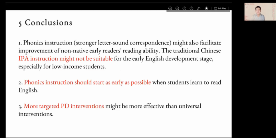 范德堡大学博士生张鑫杰汇报了《Reforming How Reading is Taught: Experimental Evidence on the Effects of Systematic Phonics Instruction for Low Socioeconomic Status Early Readers》一文。研究通过教师层面的随机实验,分析了系统化语音教学对中国农村5120名来自低社会经济地位(low-SES)家庭的七年级早期英语读者的英语阅读能力的影响。研究发现在培训课程结束后的两个月内,接受系统语音教学的学生比接受国际音标教学的学生得分高0.112个标准差。这种效果一直持续到七年级下学期。干预后,教师与学生的教学和学习态度及行为都发生了实质性的转变。研究结果表明,系统语音教学可能对中国农村低社会地位家庭的早期英语读者的阅读发展起到关键作用。随后两位点评专家肯定了本研究的现实意义和方法严谨性,指出本文为教学方法向更先进方向转变提供了实证证据,而后双方就干预之外其他因素对学生和教师的影响及相关研究发现展开了进一步讨论。
