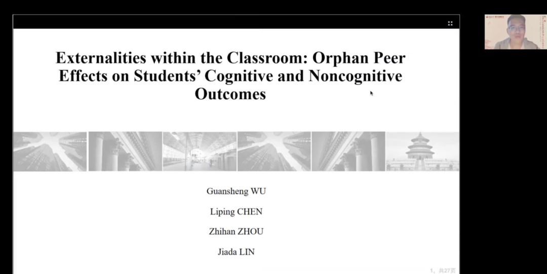 湖南大学博士生吴莞生汇报了《Externalities within the Classroom: Orphan Peer Effects on Students’Cognitive and Noncognitive Outcomes》一文,研究了接触孤儿同伴对初中学生的认知和非认知结果的影响。通过对初中八年级学生的全国性调查,研究发现接触到更多孤儿同伴的学生在认知和非认知方面的表现更差。机制分析表明,课堂上更多的孤儿同伴会诱发更差的课堂环境、更少的学生学习努力和更消极的教学行为。随后两位点评专家就孤儿的定义、研究结果、质性研究可能的补充等方面与汇报人展开交流。