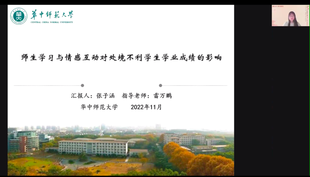 华中师范大学博士生张子涵汇报了《师生学习与情感互动对处境不利学生学业成绩的影响》一文。研究利用“中国教育追踪调查”(CEPS)的两期数据,发现师生学习与情感互动对处境不利学生学业成绩存在显著正向影响、不同类型的师生互动对不同类型处境不利学生群体学业成绩的影响存在差异、师生互动通过增强处境不利学生的学习毅力提高学生的学业成绩。因此,教师应高度关注处境不利学生的学习和情感问题并以积极方式回应;师生互动应更加契合不同处境不利学生群体的需求,以提高教师学习和情感支持的实效性;教师评价改革应更加关注过程性评价,激励教师关注处境不利学生的成长过程,扭转教师仅仅“为优而教”的短视行为。随后两位点评专家肯定了选题的意义,从“处境不利”的定义、中介效应的解释等方面给出建议。