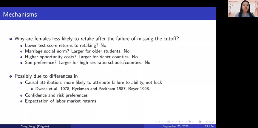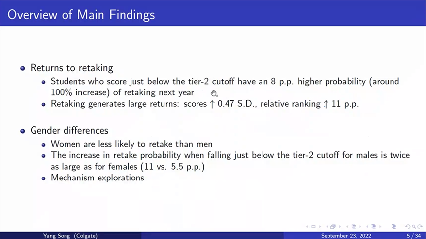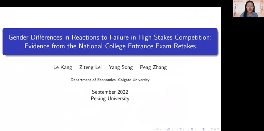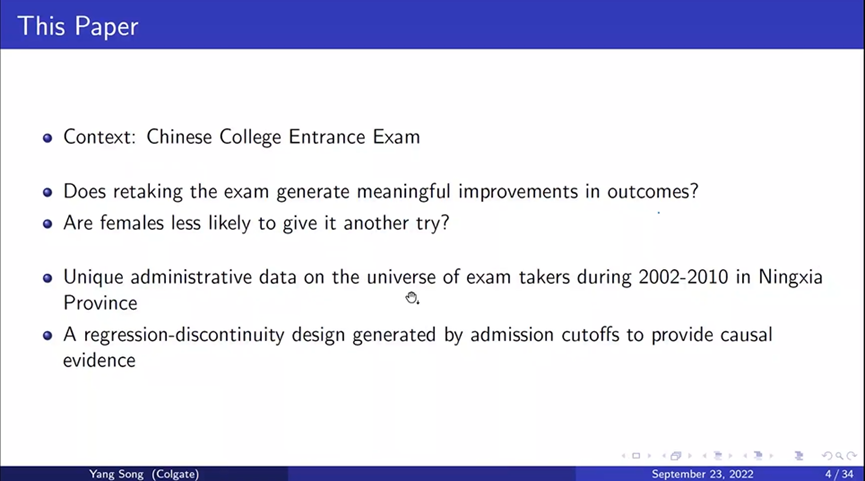 2022年9月23日晚上,北京大学教育经济研究所举办2022年第5期青年学者系列讲座。本期讲座的主题为“面对高风险竞争失利后男女反应的差别:来自中国高考复读的证据(Gender Differences in Reactions to Failure in High-Stakes Competition: Evidence from the National College Entrance Exam Retakes)”,由科尔盖特大学经济学院副教授宋阳(Yang Song, Associate Professor, Department of Economics, Colgate University)主讲。