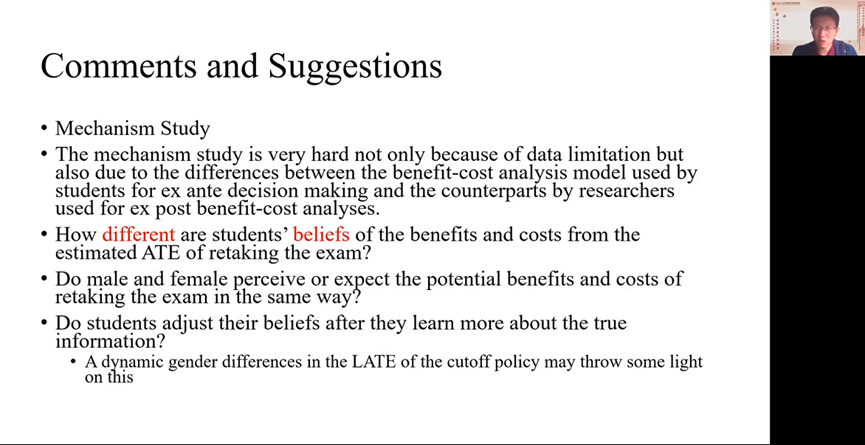 点评人王迪助理教授对该研究的重要性、严谨性、规范性等给予了高度肯定,指出该研究将高考制度安排和断点回归设计结合,是一篇利用断点回归开展实证研究的范文;采用排除法进行机制探讨是一种基于有限数据的巧妙方法,对未来的研究具有很强的启发性。王老师建议,可以增加与行为经济学、实验经济学已有文献的对话,讨论高考本身和利用游戏等实验方法构造的高风险竞争环境的区别,以强调高考的现实意义和重要性;由于该研究没有提供非认知能力的性别差异的直接证据,可以考虑从其他角度对该方面的贡献予以补充;学生或家长在决策时的事前分析和学者研究时的事后成本效益分析可能存在差异,比如学生对复读的成本收益的感知及男女性的认识差异和研究中的估计可能不同,可以通过调查、干预等方式更加深入地了解学生及其家庭对复读的认识;随着信息的增加,男女性对复读的认识可能发生变化,可以进一步分析性别差异随时间的变化。此外,王老师还分享了三篇与该研究主题相关的最新的论文。