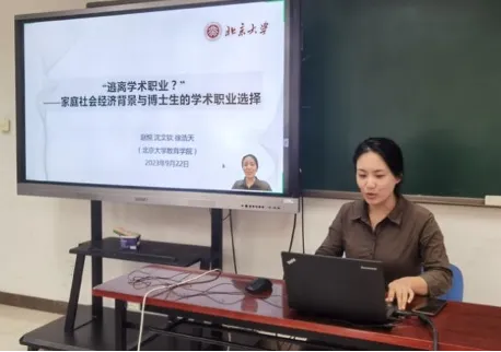 北京大学博士生赵悦汇报了题为《“逃离学术职业”——家庭社会经济背景与博士生的学术职业选择》一文。该研究基于具有全国代表性的大规模博士生调查数据,探究家庭经济背景对博士生学术职业选择的影响效果和作用机制。研究发现,博士生的家庭年收入水平越高,在实际选择中越倾向于逃离学术职业(含博士后);父母职业对博士毕业生的学术职业选择有显著影响;与家庭社会经济背景处于优势的博士生相比,处于劣势的博士生对学术职业的偏好更高、论文发表数量也更高。随后,点评专家从中介变量的选择逻辑和模型设置等方面提供了指导和改进建议,鼓励作者进一步将国际视野和本土情况相融合、加强研究结论与理论的对话。