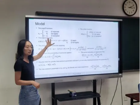 上海交通大学的程鑫慧汇报了题为《Loss Aversion and the Gender Gap in the Access to Education: Evidence from College Applications》一文,探讨了损失厌恶与受教育机会中的性别差异,具体讨论申请费的增加是否会带来申请人的性别差异及背后的机制,以及在特定类型的学校中,性别差异是否更大。基于U.S News和IPEDS数据的研究结果表明,女性比男性更厌恶损失,申请费的提高降低了女性申请者的比例,在公立院校、以STEM为重点的院校和选拔性较低的院校中,这种影响更大,且这一现象在已有的研究中常被忽视。随后在场的点评专家就研究发现的阐释与汇报者展开讨论,并从核心概念的界定、分析对象的动态变化等角度提出指导和建议。