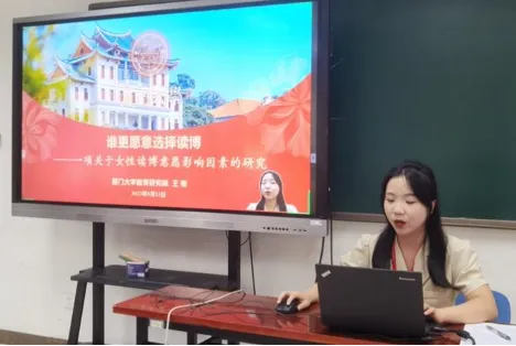 厦门大学博士生王艳汇报了《谁更愿意选择读博——一项关于女性读博意愿影响因素的研究》一文。该研究基于半结构化访谈和搜集的豆瓣小组网友的匿名帖等资料,对影响女性读博意愿的内隐性因素及内在关联性动态过程进行了讨论分析。研究发现,由经济资本、文化资本和社会资本共同构成的家庭资本是女性读博的基础条件;女性读博受到内外部情境共同影响,社会观念和人际支持是影响女性是否选择读博及能否顺利毕业的重要驱力;社会性别和生理性别共同建构女性读博的自我认知。在场的点评专家肯定了选题的重要性和写作的规范性,从增加国际比较、异质性分析及控制自选择偏差等方面提出了进一步的完善方向。