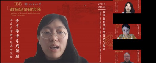 2021年1月30日上午,北京大学教育经济研究所举办了2021年第2期青年学者系列讲座。本期讲座主题为“在线教育质量的评估与提升”,由纽约大学博士后研究员李秋劼博士主讲。北京大学教育经济研究所副所长、教育学院副教授马莉萍主持了会议,美国马里兰大学助理教授刘璟和清华大学教育研究院助理教授郭菲对报告进行了点评,海内外千名师生通过腾讯会议、腾讯会议直播和B站直播等线上方式参与会议。