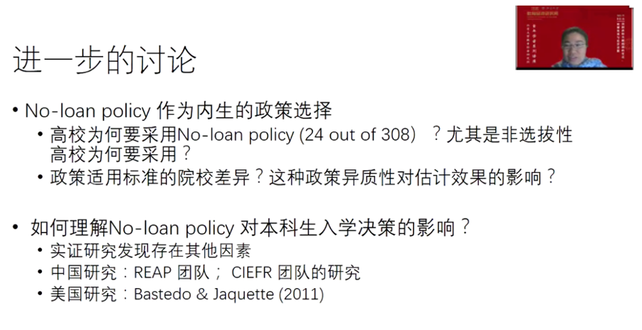 随后,教育经济与管理系主任杨钋长聘副教授和布朗大学博士后叶晓阳博士两位嘉宾围绕朱琼博士的分享进行了点评。杨钋教授认为,朱琼博士的研究独辟蹊径,研究范式和方法较为前沿,讨论了这两项研究与中国研究的相关性,并进一步就No-loan policy作为内生的政策选择、如何理解No-loan policy对本科生入学决策的影响、理论适切性和机制研究等方面与朱琼博士进行了讨论。
