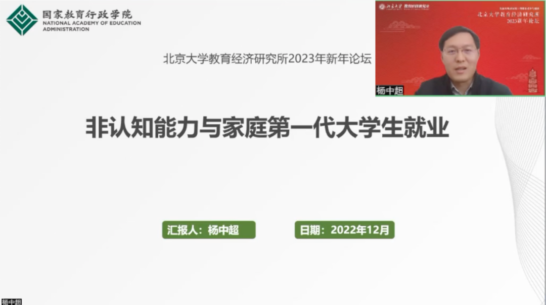 国家教育行政学院副研究员杨中超分享了题为《非认知能力与家庭第一代大学生就业》的报告。基于全国高校本科毕业生的问卷调查数据,本文探讨了非认知能力对家庭第一代大学生就业的影响。主要结论有如下三点:第一,第一代大学生身份可以显著预测大学生的毕业去向。具体而言,一方面,第一代大学生更倾向于单位就业而非升学,另一方面,其成功实现单位就业的可能性更高。第二,非认知能力是大学生就业结果的重要影响因素,且这种影响在第一代和非一代大学生群体间不存在显著差异。具体而言,非认知能力不仅会显著影响毕业生的毕业去向,而且还会预测其工作起薪和工作满意度;在控制其他变量后可知,非一代大学生的非认知能力显著高于第一代大学生。第三,在就业结果上,认知能力与非认知能力发挥着相互补充或替代作用,且在两代群体之间不存在显著差异。具体而言,在对就业去向的影响上,学业成绩和自尊相互促进,韧性和学业成绩则相互替代。进一步分析显示,这种相互作用在第一代和非一代大学生群体间不存在显著差异。最后,文章建议一是要有意识地培养学生的非认知能力,提升学生在劳动力市场的竞争力,二是要继续完善劳动力市场绩效原则,不断促进就业公平。
