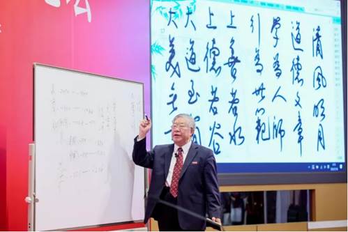 北京大学中文系教授、博士生导师程郁缀在《古典诗歌与人文精神》报告中,以笔走龙蛇的白板板书,介绍了源远流长的中国古代诗歌作品的发展脉络,以及其中蕴含的中华民族的境界与情怀。黄河流域的《诗经》与长江流域的《楚辞》作为诗歌起源滋养着中华民族子孙,后来古典诗歌的发展也是百花齐放、精彩纷呈。从爱国诗人到诗仙李白、诗圣杜甫;从建安文学道唐诗宋词,中华历史上的文化先贤跃然纸上,诗歌发展气势磅礴,生动讲述了诗人的生平思想与傲骨正气。此外,程郁缀也讲述了做人立身的标准,一个人如果能做到“知恩、感恩、报恩”,就意味着一个人的人格是健全的。