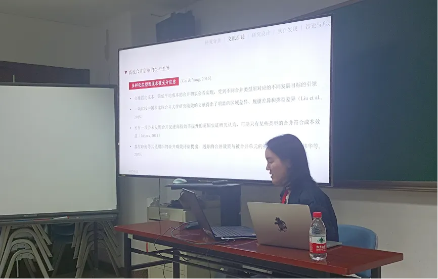 北京大学博士生杜思慧汇报了《“合”而不同:高校合并对内部经费配置的异质性影响研究》一文,考察了合并对高校内部经费配置的总体性和异质性影响。研究发现,在本科院校的合并实践中,支出方面的规模经济与规模不经济现象并存,且不同的院校类型和合并类型均对高校内部经费配置产生了异质性的影响。随后两位点评专家在论文的理论选择和对不同类型研究对象的细化方面提出了相关建议。