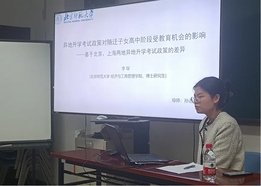 北京师范大学博士生李琛汇报了《异地升学考试政策对随迁子女高中阶段受教育机会的影响——基于北京、上海两地异地升学考试政策的差异》一文,研究了北京、上海两地不同的异地升学考试政策对随迁子女高中阶段受教育机会的差异化影响,并发现,虽然从文本分析可以得出北京政策更严格的猜想,但实证结果表明上海的政策在提高随迁子女高中受教育机会方面的效应更小,反而增大了不同家庭背景间结果的差异。两位点评专家就不同类型高中入读结果的细分提出了改进建议。